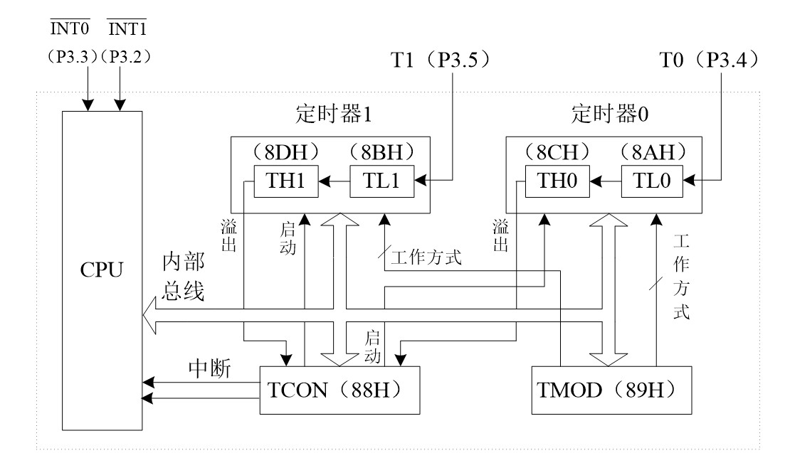 - GATE: 0时定时器不受外部控制, 1时定时器需要在P3.2(P3.3)引脚处于高电平时开始计数