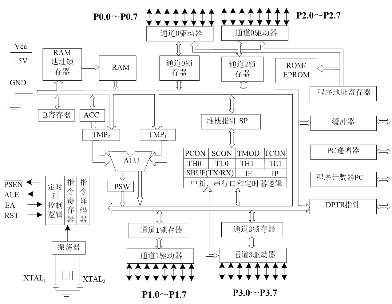 - ~EA/Vpp: 高电平时使用内部4KB程序存储器; 低电平时全部使用外部程序存储器