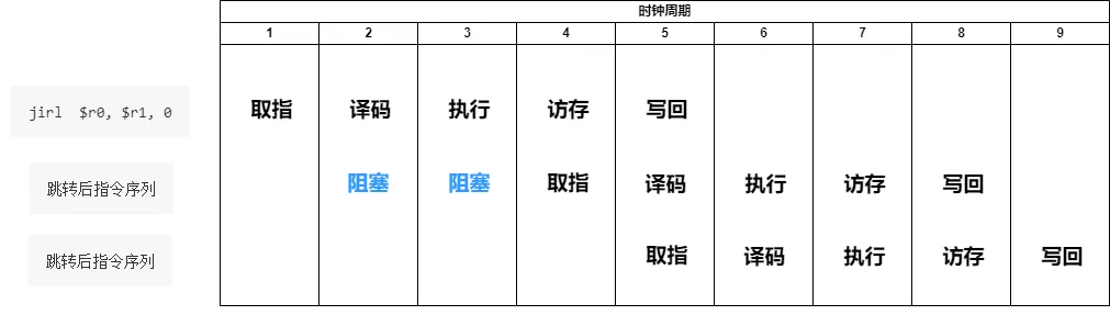 为了解决这个问题,可以通过在取指阶段引入2拍的流水线阻塞来解决,此时时空图如下: