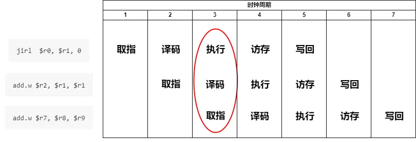 我们注意到在第3周期jirl指令被执行的时候,两条add.w指令已经进入流水线,而这两条指令是不需要被执行的,这就引发了控制冲突。