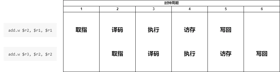 我们注意到在第3个时钟周期时,第2条指令读取r2寄存器的值,但此时第1条指令未执行写回,也就是说读取到r2寄存器的值并非是最新的、正确的值,第2条指令的运行数据必然是错误的。