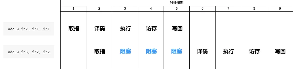 回顾前文中使用阻塞处理冲突时,被阻塞的指令之后的指令也由于执行部件被占用而无法在流水线中执行,一起被堵在后面。