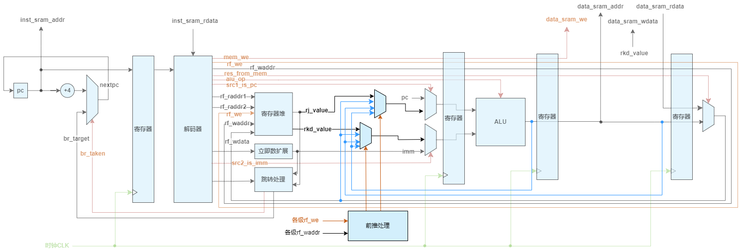 inst_sram_we和data_sram_we都从1比特的写使能调整为4比特的字节写使能 - 在流水线CPU中,调试定错可以基于级间寄存器的内容判断